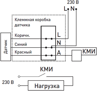 - Закрепите основной блок датчика на опорной поверхности и выполните электрическое соединение проводников питания и нагрузки с проводниками датчика в соответствии с нижеприведенной схемой.