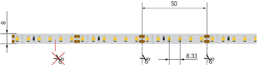 Ленту можно разрезать только в обозначенных местах по линии между контактными площадками для пайки.