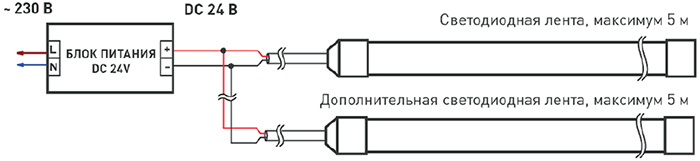 - Максимальная длина подключения ленты - 5 метров.