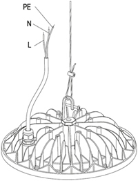Светильник монтируется на подвесе непосредственно за крюк или на тросе (троса в комплекте нет). Светильник предназначен для подключения к электрической цепи с выключателем.